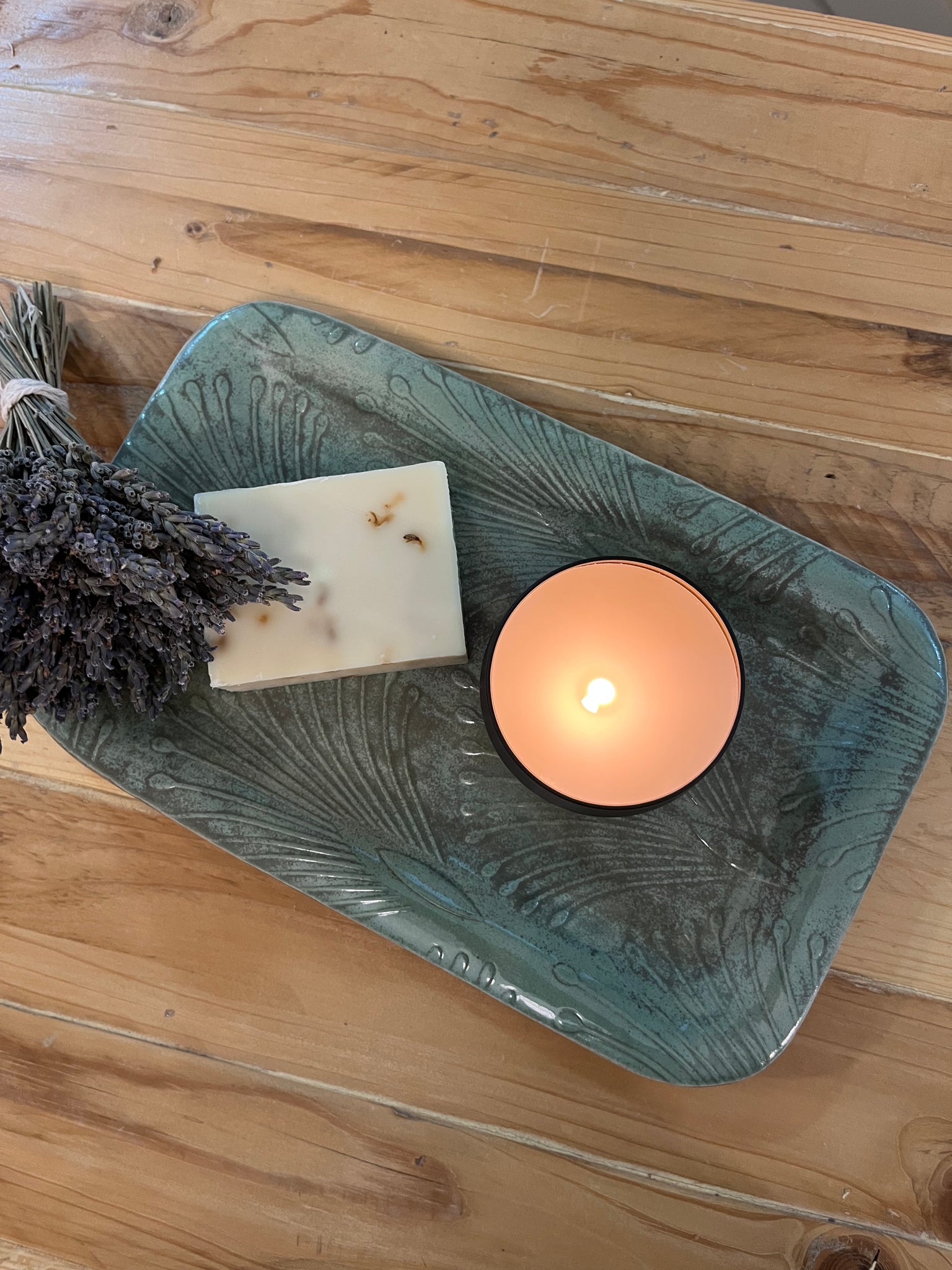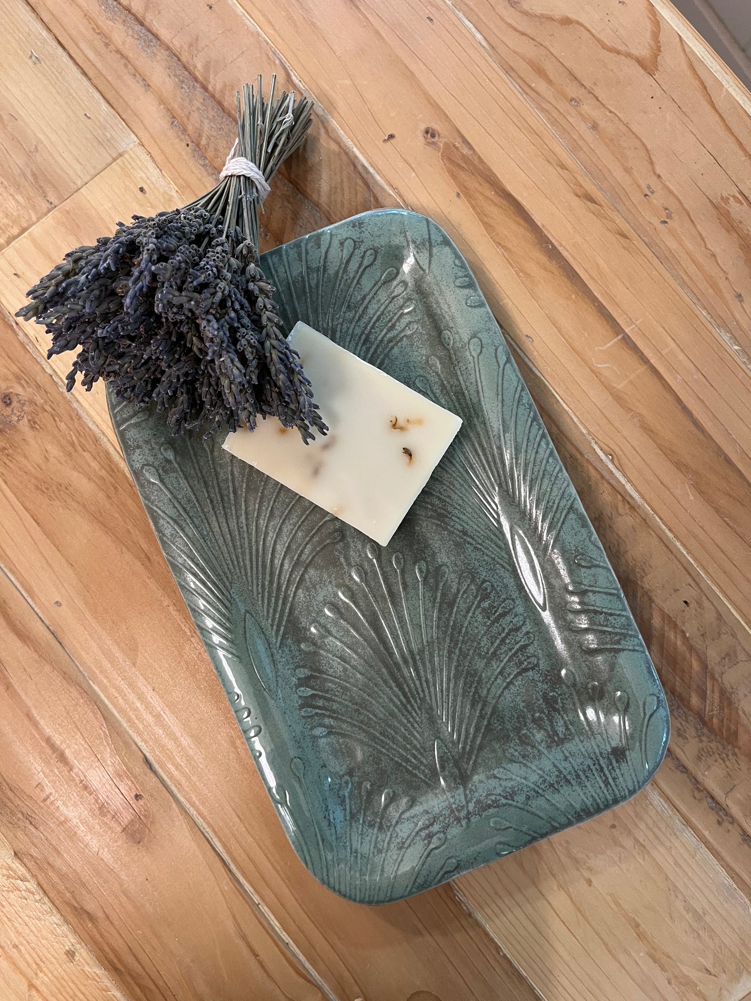 מגש הקרמיקה בעבודת יד זה מציג עיצוב מרהיב עם הטבעות מיוחדות, אשר מזכירות פרחים עדינים או נוצות טווס. ההטבעות הללו משולבות בעדינות בחומר, יוצרות טקסטורה עשירה ומורכבת שמוסיפה למגש מראה ייחודי ומעניין.