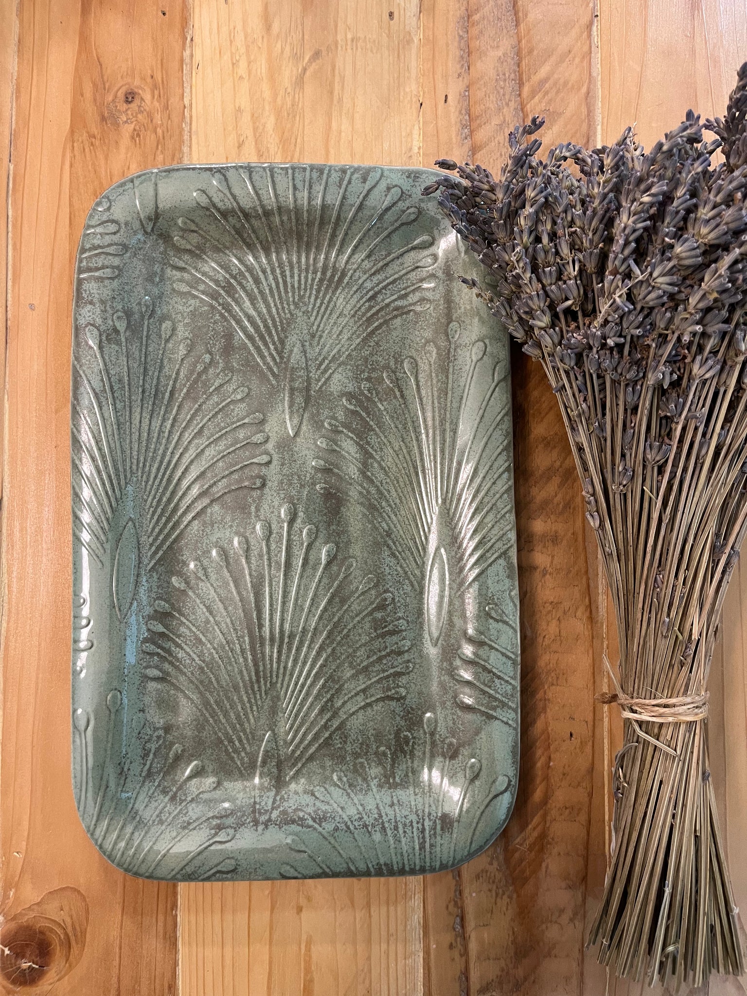 עם גוונים ירוקים רכים ומעודנים, המגש נושא עמו תחושת טבעיות ורוגע. ההטבעות מעניקות לו עומק ועניין, מה שהופך אותו לפריט דקורטיבי מרהיב, מושלם להגשת מנות או לשימוש כפריט קישוטי.