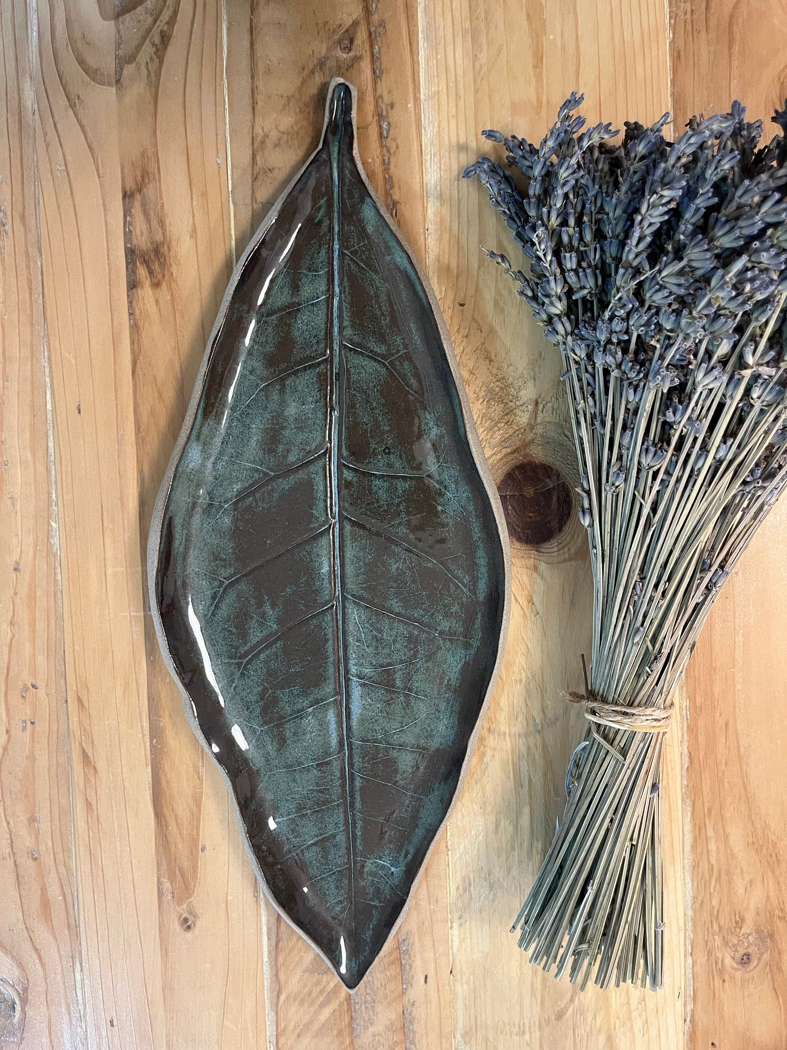 מגש הקרמיקה הזה, בעבודת יד, מתהדר בעיצוב ייחודי המוטבע מעלה אמיתי, מה שהופך אותו ליצירה חד-פעמית. צורת העלה המדויקת והפרטים המדויקים ברקע מקנים לו מראה אורגני ומיוחד.