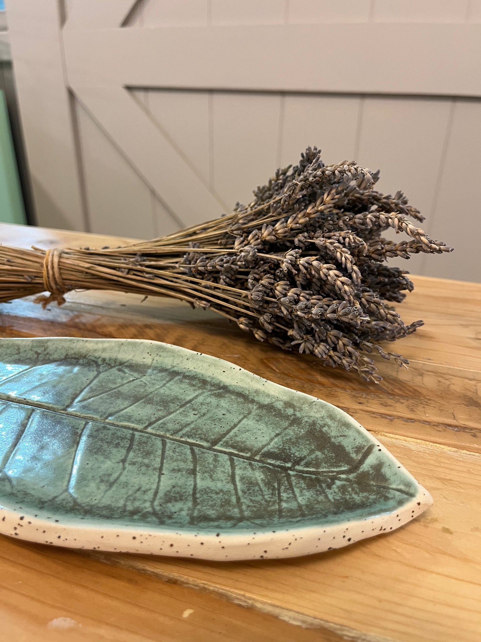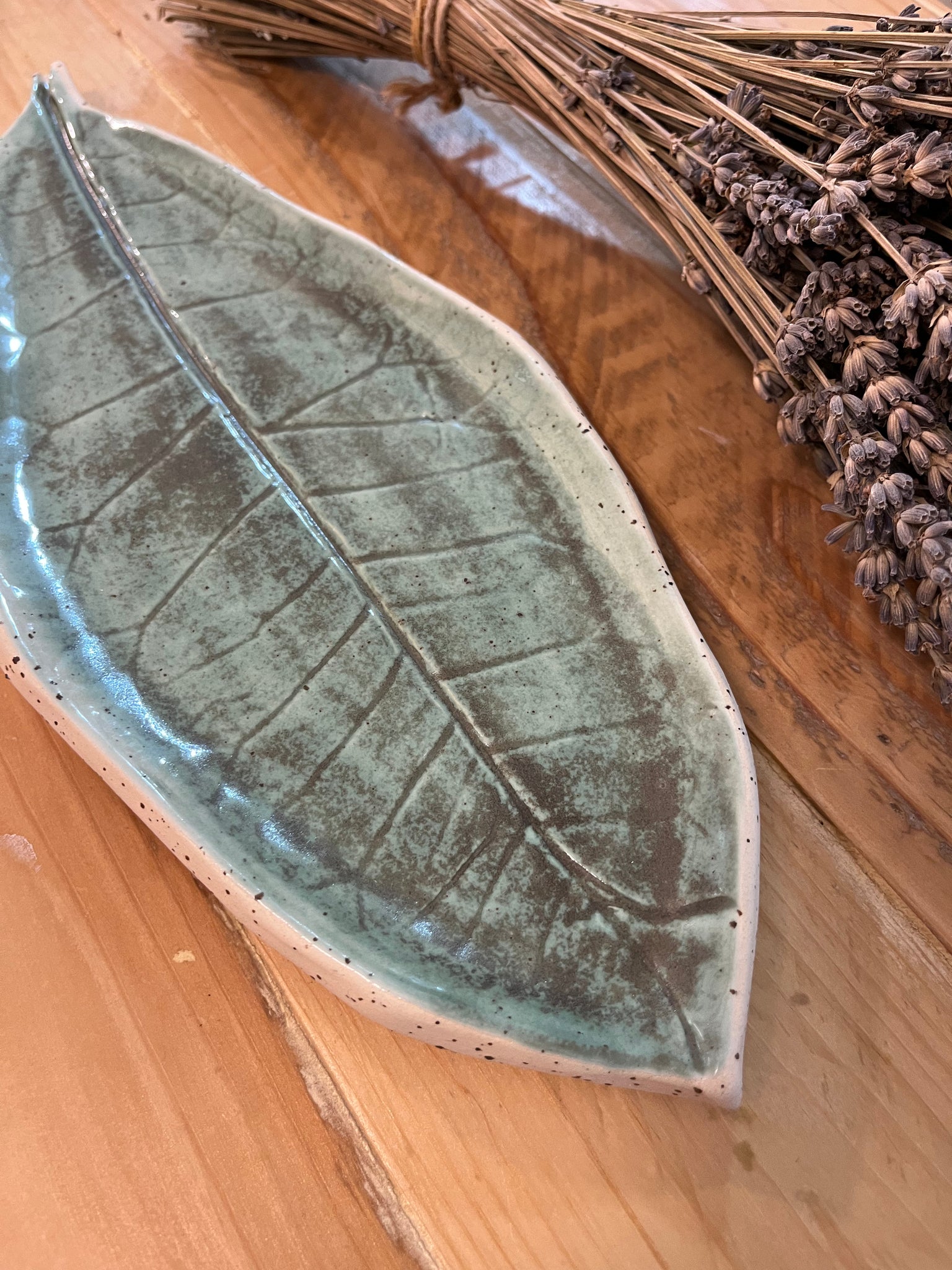 מגש הקרמיקה הזה, בעבודת יד, מתהדר בעיצוב ייחודי המוטבע מעלה אמיתי, מה שהופך אותו ליצירה חד-פעמית. צורת העלה המדויקת והפרטים המדויקים ברקע מקנים לו מראה אורגני ומיוחד.